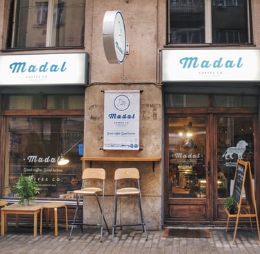 Madal Café has multiple locations in Budapest, including on Ferenciek Square, Baross utca, Arany János utca, and the Szeged airport station. Most cafés open between 8:00 AM and 8:00 PM, Monday through Saturday, with reduced hours on Sundays. Prices range from approximately 500 to 1,000 HUF for espresso-based drinks and 700–1,200 HUF for single-origin filter brews. Bean packages (200g) cost between 2,400 and 3,400 HUF, depending on origin. The cafés take card and cash payments, offer free Wi-Fi, and allow takeaway orders. They provide equipment rental or retail for home brewing gear. Wheelchair access is available at certain locations, though not all entrances accommodate strollers easily. Each café location offers limited seating—intended for focused coffee consumption rather than extended dining. The cafés are busiest mid-morning and late afternoon; early morning and early evening are quieter. No outside food is accepted. Public transit connections (metro line 3, trams, buses) serve all central outlets. They do not serve full meals but offer pastries, croissants, and light snacks. They encourage lingering but request that peak customers vacate their seats after one to two cups. The cafés are pet-friendly, with water bowls available.